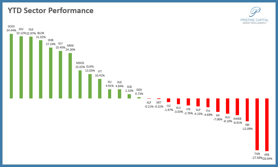SOXX semiconductor stocks are the YTD winners, with IGV software stocks, and XLK megacap technology, and BLOK blockchain trailing close behind. TAN solar and KRE regional banks are the worst YTD performers.