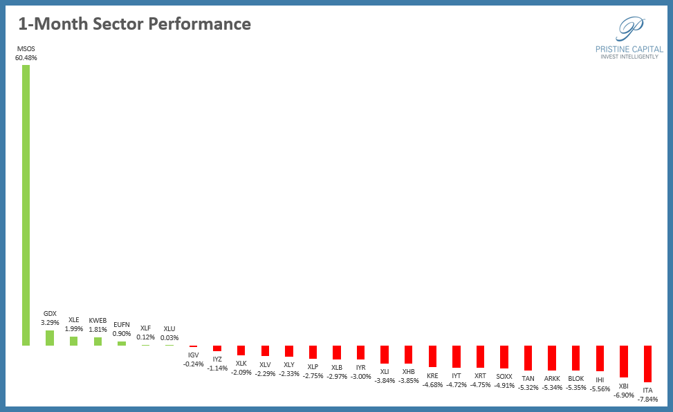 On the 1-month timeframe, MSOS cannabis stocks are the standout by FAR. Only 7/27 of our tracked groups are in positive territory.