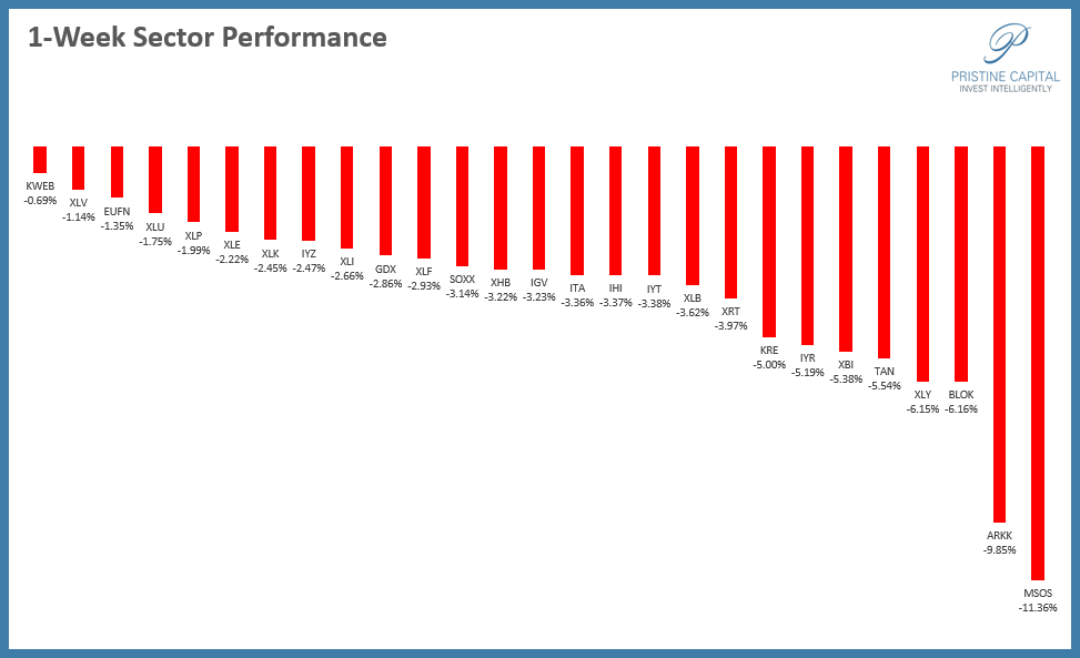 On the 1-week timeframe, all tracked sectors were red, but KWEB Chinese internet names were the top performer! The more speculative areas of the market like ARKK innovation and MSOS cannabis were hit the hardest by selling.