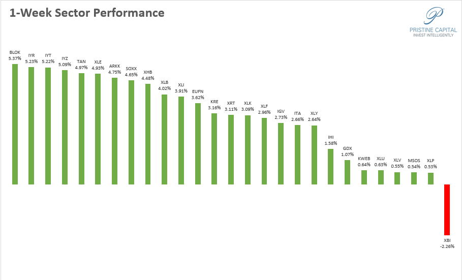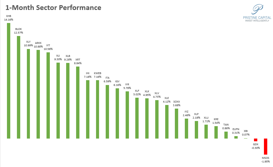On the 1-month timeframe, XHB homebuilders and BLOK blockchain are leading the pack.