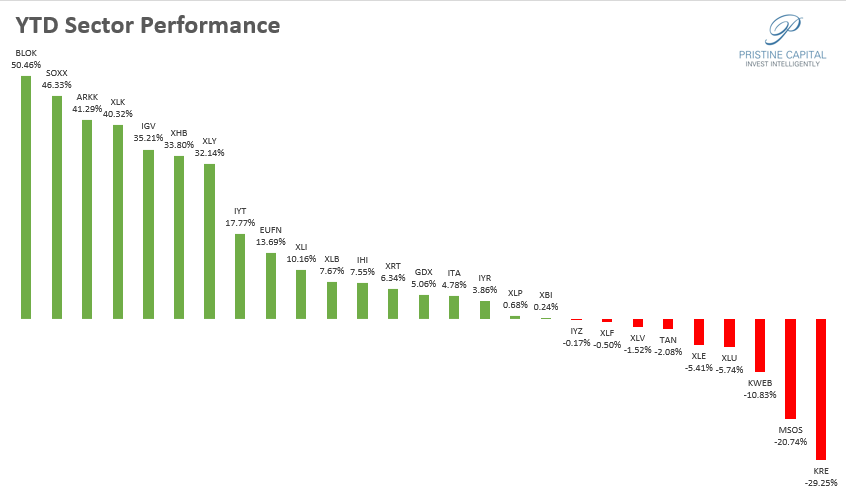 The big winners in the first half of the year are as follows: BLOK blockchain technology SOXX semiconductors and ARKK innovation stocks. KRE regional banks are at the bottom of the pack as we head into a fresh earnings season beginning 7/12.
