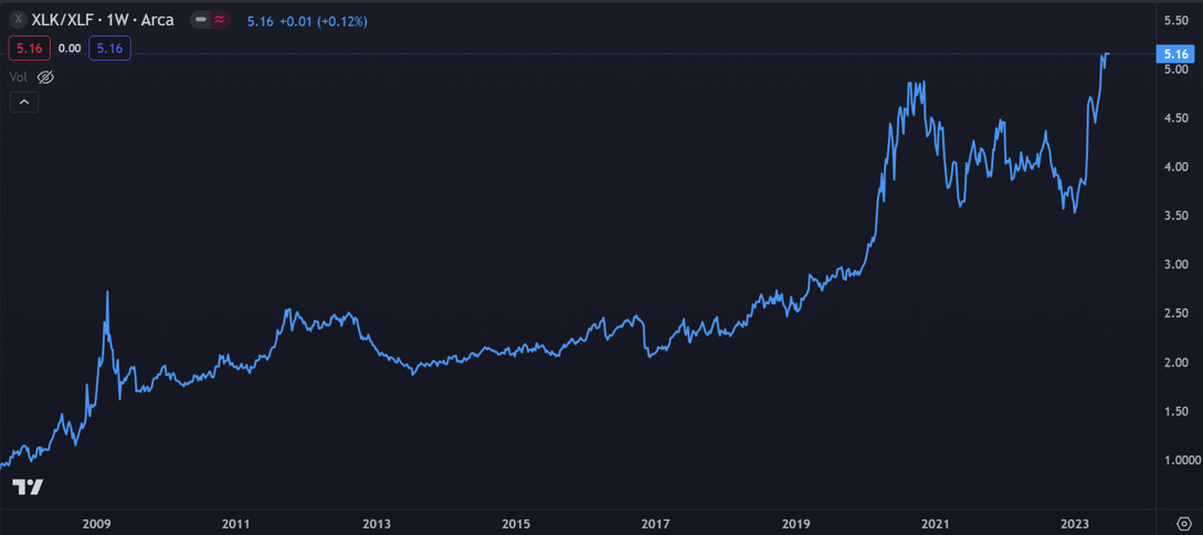 The ratio of XLK megacap tech to XLF financials performance is at record highs.