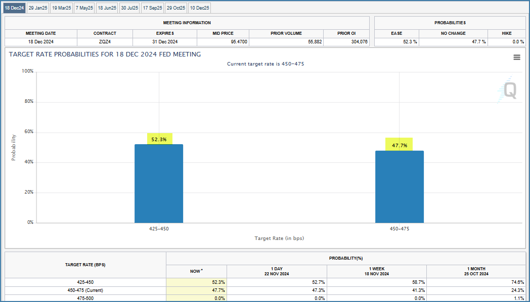 Each incoming data point matters more given that the upcoming Fed meeting is ‘in-play’. There is a 52.4% chance that the fed will cut rates on 12/18 👇