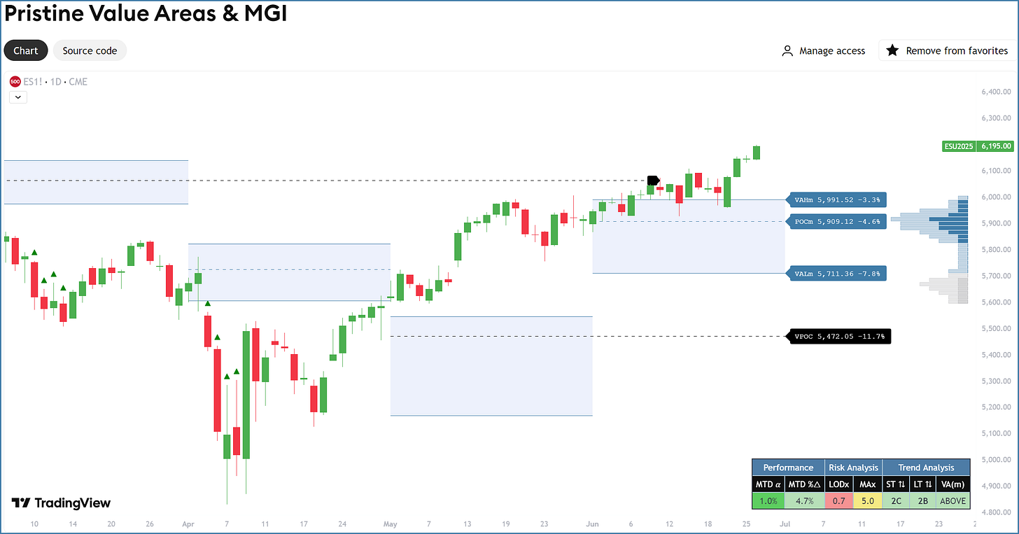 The cornerstone of my technical process. This tool automatically renders key Market Profile structures (VAH, VAL, POC, and VPOCs) across multiple timeframes, helping you instantly identify market regimes.