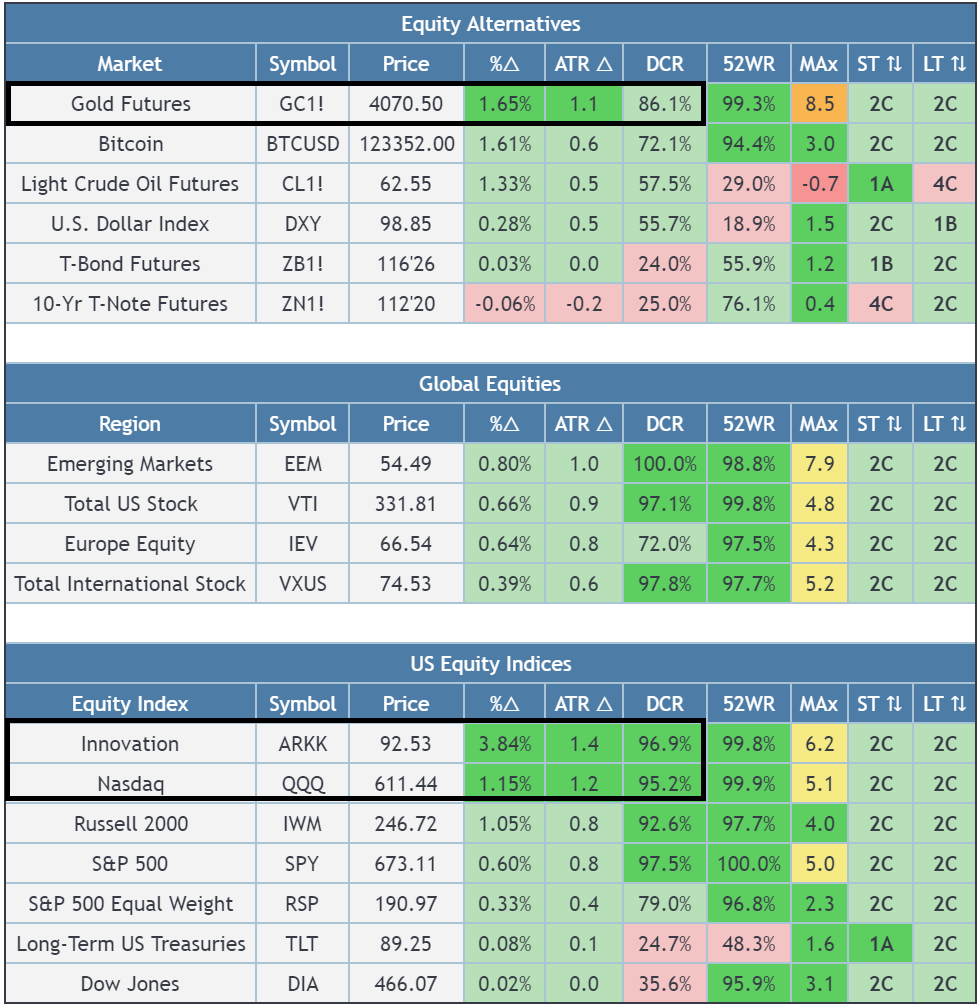 GC Gold, ARKK Innovation, QQQ Nasdaq > 1 ATR moves (dark green shading)👇