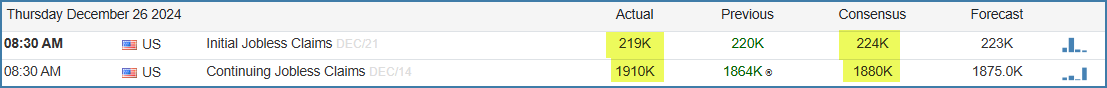 Initial jobless claims came out slightly below expectations, but continuing jobless claims came in slightly higher than expectations 👇